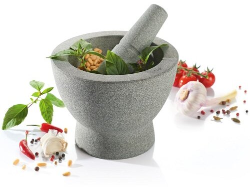 Würzigen Doppelnutzen bringt der große Granit-Mörser in die Küche, denn er ist beidseitig verwendbar – für kleine Mengen Gewürz oder größere Mengen Pesto und Kräuterpaste.